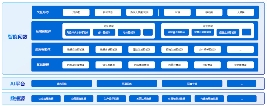 智能問數(shù)采用檢索增強生成(RAG)、大語言模型(LLM)、智能體(Agent)等AI技術,通過對話模式,根據(jù)用戶提出的問題和背景信息,由大模型理解用戶意圖后,在海量數(shù)據(jù)中進行檢索,并以文本總結、表格、圖表等多種形式輸出,讓用戶能夠快速查詢、分析和洞察數(shù)據(jù)。