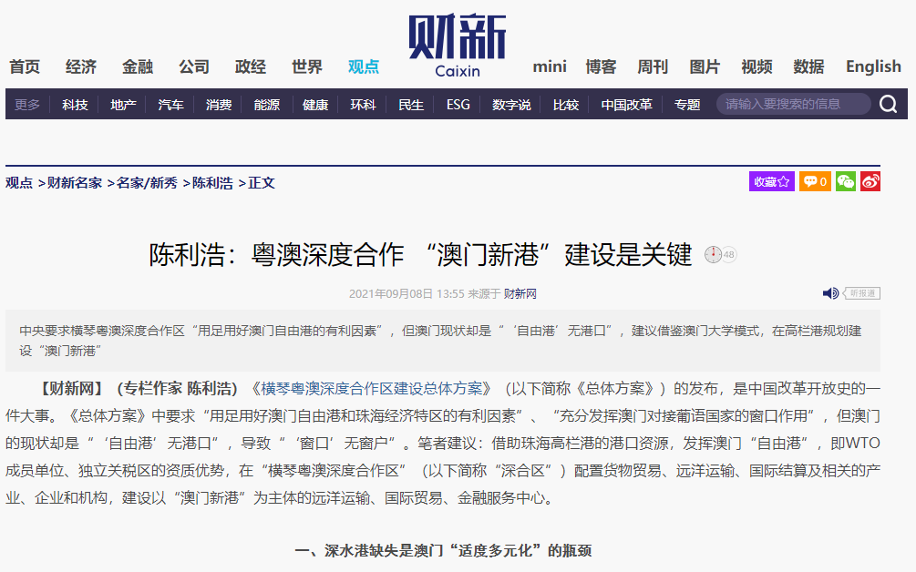 如已安裝財新APP請點擊:https://opinion.caixin.com/2021-09-08/101770508.html 粵澳深度合作 “澳門新港”建設(shè)是關(guān)鍵 陳利浩 《橫琴粵澳深度合作區(qū)建設(shè)總體方案》(以下簡稱《總體方案》)的發(fā)布,是中國改革開放史的一件大事?!犊傮w方案》中要求“用足用好澳門自由港和珠海經(jīng)濟特區(qū)的有利因素”、“充分發(fā)揮澳門對接葡語國家的窗口作用”,但澳門的現(xiàn)狀卻是“‘自由港’無港口”,導(dǎo)致“‘窗口’無窗戶”。筆者建議:借助珠海高欄港的港口資源,發(fā)揮澳門“自由港”,即WTO成員單位、獨立關(guān)稅區(qū)的資質(zhì)優(yōu)勢,在“橫琴粵澳深度合作區(qū)”(以下簡稱“深合區(qū)”)配置貨物貿(mào)易、遠洋運輸、國際結(jié)算及相關(guān)的產(chǎn)業(yè)、企業(yè)和機構(gòu),建設(shè)以“澳門新港”為主體的遠洋運輸、國際貿(mào)易、金融服務(wù)中心。 一、深水港缺失是澳門“適度多元化”的瓶頸 澳門在歷史上曾是遠東最繁榮的商埠之一。十六、十七世紀(jì)的澳門,作為聯(lián)結(jié)著歐洲、亞洲、拉丁美洲的海上絲路貿(mào)易大循環(huán)樞紐,轉(zhuǎn)口貿(mào)易盛況一時無比,葡萄牙人就是乘船而來。當(dāng)時的澳門,在海上交通、對外貿(mào)易和中西文化交流中都起著特殊的作用。但隨著海上運輸從帆船時代進入輪船時代,集裝箱運輸方式異軍突起,深水港成為口岸標(biāo)配、剛需,多年來澳門港口集裝箱吞吐量(萬標(biāo)準(zhǔn)箱)都降為個位數(shù)(內(nèi)地的一些“內(nèi)河港”都達百萬箱),從統(tǒng)計角度已經(jīng)可以忽略不計。位于南海之濱的澳門已成為航運視角下的“內(nèi)陸城市”。 沒有深水港使得貿(mào)易優(yōu)勢衰落、通商功能退化,葡萄牙才嘗試在澳門開設(shè)被中國內(nèi)地一貫禁止的賭場。從1847年博彩行業(yè)合法化始至1860年止,澳門地區(qū)就建設(shè)了2000多家各種類型的賭場。隨著清朝國力的日益衰敗,1887年葡萄牙強迫清朝簽署了《中葡和好通商條約》,名義上繼續(xù)租用澳門,其實擁有了澳門地區(qū)的管理權(quán),博彩行業(yè)在澳門蓬勃發(fā)展,逐步成為了澳門的支柱產(chǎn)業(yè)。澳門回歸后,隨著賭牌數(shù)量的增加,博彩業(yè)的發(fā)展勢頭更盛。 中央政府一直高度重視、持續(xù)推動澳門的適度多元化,習(xí)近平主席多次要求“橫琴要為澳門適度多元化服務(wù)”。但是,澳門港口資源的缺失又制約了通商功能,WTO成員資質(zhì)的經(jīng)貿(mào)優(yōu)勢都無從發(fā)揮,服務(wù)業(yè)、金融業(yè)等都較少應(yīng)用場景的支撐。而澳門的基礎(chǔ)和特點又較難發(fā)展科技產(chǎn)業(yè)和其他實業(yè)。近年來,因與博彩業(yè)具備互動效應(yīng),會展業(yè)在澳門的發(fā)展勢頭良好,這本是“服務(wù)貿(mào)易”的機遇,但因缺少深水港、沒有相應(yīng)的“貨物貿(mào)易”支撐,效果也不如人意。相比其他產(chǎn)業(yè)競爭優(yōu)勢的逐漸喪失,博彩業(yè)則一枝獨秀,博彩業(yè)以外的人才流失嚴(yán)重,更形成了澳門人才、產(chǎn)業(yè)結(jié)構(gòu)單一的現(xiàn)狀。與澳門從歷史上繁榮一時的貿(mào)易口岸到如今以博彩業(yè)為支柱產(chǎn)業(yè)的原因一樣,澳門適度多元化效果一直不明顯的根本原因還是缺乏深水港這一“源頭活水”。 二、賦予澳門港口資源是“深合區(qū)”建設(shè)的關(guān)鍵一招 建設(shè)“深合區(qū)”,在推動澳門適度多元化、開辟新時代改革開放的新窗口、探索和國際接軌制度融合、創(chuàng)新等方面都具有深遠的意義。所有這些,都在相當(dāng)程度上依賴于深水港資源。 如前所述,澳門“適度多元化”成效不顯著的主要原因是缺乏港口資源。當(dāng)今世界上80%的貨物都依靠水路運輸,深水港口是經(jīng)貿(mào)中心的剛需和必備。如果通過“深合區(qū)”賦予澳門深水港資源,則澳門WTO獨立成員席位、獨立關(guān)稅區(qū)地位、面向歐盟和葡語系國家(總?cè)丝诩s2.5億)的經(jīng)貿(mào)便利等優(yōu)勢都將得到挖掘,與澳門會展業(yè)相關(guān)的服務(wù)貿(mào)易優(yōu)勢也會得到進一步發(fā)揮,從而帶動海運業(yè)、進出口業(yè)、服務(wù)貿(mào)易業(yè)、金融服務(wù)業(yè)等的發(fā)展,恢復(fù)“海上絲綢之路重鎮(zhèn)”的雄風(fēng),吸引其他相關(guān)產(chǎn)業(yè),改變博彩業(yè)“一枝獨秀”的局面。 中國改革開放的前40多年,香港是對外交流的主要窗口,起著連接世界的橋頭堡、紐帶的作用,如內(nèi)地出口貨物一度曾有近半經(jīng)由香港轉(zhuǎn)口,內(nèi)地外商投資增量的三分之二都經(jīng)由香港。所有這些,主要依賴于香港作為航運、貿(mào)易、商業(yè)、金融中心的地位,其基礎(chǔ)就是香港的“深水良港”。新時代改革開放需要開辟新的窗口,澳門應(yīng)是不二選擇。而要作為對外開放的窗口,必須具備以深水良港為基礎(chǔ)的航運、貿(mào)易、金融等功能。要承擔(dān)這一歷史重任的澳門,理應(yīng)被賦予港口資源、變“內(nèi)陸城市”為“海洋城市”。 《總體方案》要求深合區(qū)“逐步構(gòu)建民商事規(guī)則銜接澳門、接軌國際的制度體系”, “建立與澳門銜接、國際接軌的監(jiān)管標(biāo)準(zhǔn)和規(guī)范制度”,意味著中國商事、民事等法律、制度和