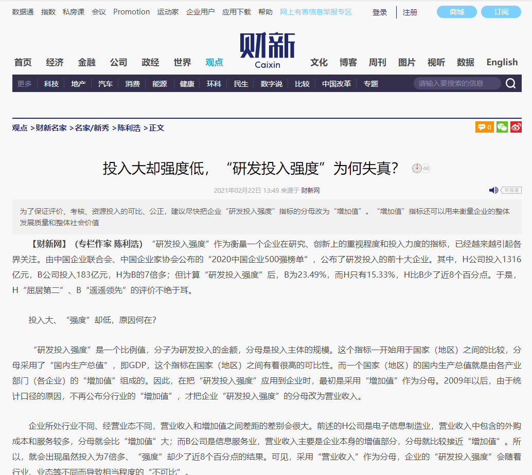 如已安裝財(cái)新APP請(qǐng)點(diǎn)擊:https://opinion.caixin.com/2021-02-22/101665535.html 投入大卻強(qiáng)度低,“研發(fā)投入強(qiáng)度”為何失真? 陳利浩 “研發(fā)投入強(qiáng)度”作為衡量一個(gè)企業(yè)在研究、創(chuàng)新上的重視程度和投入力度的指標(biāo),已經(jīng)越來越引起各界關(guān)注。由中國(guó)企業(yè)聯(lián)合會(huì)、中國(guó)企業(yè)家協(xié)會(huì)公布的“2020中國(guó)企業(yè)500強(qiáng)榜單”,公布了研發(fā)投入的前十大企業(yè)。其中,H公司投入1316億元,B公司投入183億元,H為B的7倍多;但計(jì)算“研發(fā)投入強(qiáng)度”后,B為23.49%,而H只有15.33%,H比B少了近8個(gè)百分點(diǎn)。于是,H“屈居第二”、B“遙遙領(lǐng)先”的評(píng)價(jià)不絕于耳。 投入大、“強(qiáng)度”卻低,原因何在? “研發(fā)投入強(qiáng)度”是一個(gè)比例值,分子為研發(fā)投入的金額,分母是投入主體的規(guī)模。這個(gè)指標(biāo)一開始用于國(guó)家(地區(qū))之間的比較,分母采用了“國(guó)內(nèi)生產(chǎn)總值”,即GDP,這個(gè)指標(biāo)在國(guó)家(地區(qū))之間有著很高的可比性。而一個(gè)國(guó)家(地區(qū))的國(guó)內(nèi)生產(chǎn)總值就是由各產(chǎn)業(yè)部門(各企業(yè))的“增加值”組成的。因此,在把“研發(fā)投入強(qiáng)度”應(yīng)用到企業(yè)時(shí),最初是采用“增加值”作為分母。2009年以后,由于統(tǒng)計(jì)口徑的原因,不再公布分行業(yè)的“增加值”,才把企業(yè)“研發(fā)投入強(qiáng)度”的分母改為營(yíng)業(yè)收入。 企業(yè)所處行業(yè)不同、經(jīng)營(yíng)業(yè)態(tài)不同,營(yíng)業(yè)收入和增加值之間差距的差別會(huì)很大。前述的H公司是電子信息制造業(yè),營(yíng)業(yè)收入中包含的外購(gòu)成本和服務(wù)較多,分母就會(huì)比“增加值”大;而B公司是信息服務(wù)業(yè),營(yíng)業(yè)收入主要是企業(yè)本身的增值部分,分母就比較接近“增加值”。所以,就會(huì)出現(xiàn)雖然投入為7倍多、“強(qiáng)度”卻少了近8個(gè)百分點(diǎn)的結(jié)果。可見,采用“營(yíng)業(yè)收入”作為分母,企業(yè)的“研發(fā)投入強(qiáng)度”會(huì)隨著行業(yè)、業(yè)態(tài)等不同而導(dǎo)致相當(dāng)程度的“不可比”。 “研發(fā)投入強(qiáng)度”這個(gè)指標(biāo)的作用,已經(jīng)從導(dǎo)向、評(píng)價(jià)發(fā)展到考核、甚至資源分配。企業(yè)資質(zhì)評(píng)定、科技經(jīng)費(fèi)投入、政府資金支持等等,都依賴這個(gè)指標(biāo)。而且,在所有場(chǎng)合下都只看指標(biāo)數(shù)值本身、不做差異分析。比如,不會(huì)對(duì)電子信息制造業(yè)和電子信息服務(wù)業(yè)制定不同的標(biāo)準(zhǔn)。從2020年開始,國(guó)務(wù)院國(guó)資委也把“研發(fā)投入強(qiáng)度”作為對(duì)央企僅有的五個(gè)考核指標(biāo)之一,也沒有因央企的不同行業(yè)、不同性質(zhì)而制定不同的考核標(biāo)準(zhǔn)。 因此,為了保證評(píng)價(jià)、考核、資源投入的可比、公正,建議盡快把企業(yè)“研發(fā)投入強(qiáng)度”指標(biāo)的分母改為“增加值”。而且,既然地區(qū)、城市的“研發(fā)投入強(qiáng)度”的分母是國(guó)內(nèi)生產(chǎn)總值,企業(yè)的“研發(fā)投入強(qiáng)度”的分母就應(yīng)該是“增加值”,邏輯、體系才能自洽。分母改為“增加值”之后,由于增加值低于營(yíng)業(yè)收入,強(qiáng)度指標(biāo)的計(jì)算結(jié)果都會(huì)程度不同提高,因此,建議同時(shí)相應(yīng)提高考核、評(píng)價(jià)的標(biāo)準(zhǔn)值。 “增加值”不是現(xiàn)成的財(cái)務(wù)指標(biāo),但是,企業(yè)從已有的財(cái)務(wù)指標(biāo)中,不需要重新歸集、只通過簡(jiǎn)單的計(jì)算就能得到,而且,計(jì)算結(jié)果完全是可驗(yàn)證、可核查的。這種計(jì)算、驗(yàn)證、核查,不需要依賴統(tǒng)計(jì)部門的統(tǒng)計(jì)數(shù)據(jù)。因此,把“研發(fā)投入強(qiáng)度”的分母改為“增加值”,完全具備可操作性。 在考慮、提出用增加值作為研發(fā)投入強(qiáng)度分母的建議時(shí),筆者還聯(lián)想到了對(duì)企業(yè)價(jià)值的整體評(píng)價(jià)。 中國(guó)已經(jīng)進(jìn)入新發(fā)展階段。習(xí)近平總書記在企業(yè)家座談會(huì)上要求“在愛國(guó)、創(chuàng)新、誠(chéng)信、社會(huì)責(zé)任和國(guó)際視野等方面不斷提升自己,努力成為新時(shí)代構(gòu)建新發(fā)展格局、建設(shè)現(xiàn)代化經(jīng)濟(jì)體系、推動(dòng)高質(zhì)量發(fā)展的生力軍。”對(duì)企業(yè)、企業(yè)家的的衡量和評(píng)價(jià)標(biāo)準(zhǔn)也要?jiǎng)?chuàng)新、完善,才能滿足這種新發(fā)展理念。但是,目前無(wú)論是對(duì)企業(yè)的綜合評(píng)價(jià)、還是財(cái)務(wù)考核,包括上市公司的信息披露,主要指標(biāo)就是營(yíng)業(yè)收入和利潤(rùn)。營(yíng)業(yè)收入反映的是企業(yè)的經(jīng)營(yíng)規(guī)模,但如果企業(yè)有外采、外購(gòu),則營(yíng)業(yè)收入中就會(huì)包括其外采外購(gòu)產(chǎn)品或服務(wù)所蘊(yùn)含的之前所有環(huán)節(jié)的累計(jì)投入、不完全是企業(yè)自身的經(jīng)營(yíng)結(jié)果。利潤(rùn)固然重要,但利潤(rùn