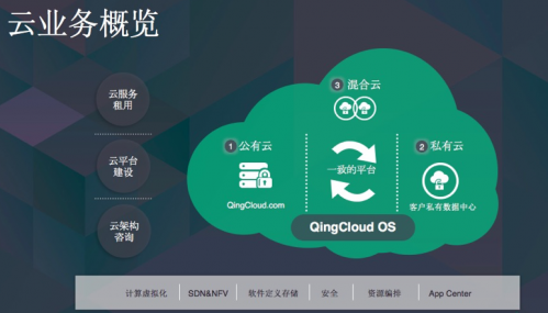 劉靚用一張圖展示了青云QingCloud的業(yè)務(wù)概覽,包括公有云、私有云以及混合云。