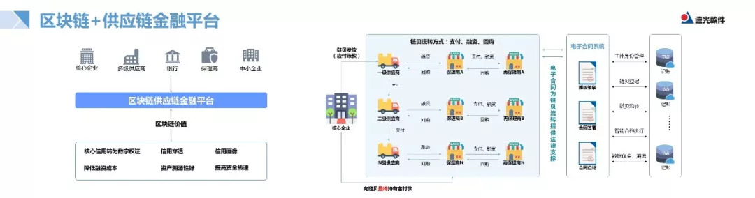 遠光區(qū)塊鏈的供應(yīng)鏈金融平臺目前發(fā)布的是1.0版本。其滿足核心企業(yè)供應(yīng)商的保理業(yè)務(wù)需求,也支持核心企業(yè)經(jīng)銷商的存貨融資。該平臺借助區(qū)塊鏈技術(shù)的信任優(yōu)勢,改進了融資模式,以特大型、大型集團企業(yè)及金融機構(gòu)為核心,以核心企業(yè)的信用為擔保,將企業(yè)的應(yīng)付賬款(供應(yīng)商的應(yīng)收賬款)轉(zhuǎn)化成數(shù)字化的債權(quán)憑證,實現(xiàn)債權(quán)的線上流轉(zhuǎn)。供應(yīng)商與保理商之間、供應(yīng)商與供應(yīng)商之間、保理商與再保理商之間可靈活進行數(shù)字憑證的拆分及轉(zhuǎn)讓,實現(xiàn)供應(yīng)商應(yīng)收賬款的線上流轉(zhuǎn)與融資。通過聯(lián)盟鏈的技術(shù)優(yōu)勢,核心企業(yè),金融機構(gòu),交易關(guān)聯(lián)方,多方記賬,保障核心企業(yè)應(yīng)付賬款數(shù)據(jù)信息的真實性和有效性,從技術(shù)層面降低金融機構(gòu)對外融資的風險。相比于商業(yè)票據(jù)等融資手段,其靈活可拆分,不需借助銀行的票據(jù)池,降低了金融機構(gòu)的準入門檻和賬務(wù)風險,提高了銀行及金融機構(gòu)的收入,穩(wěn)定了核心企業(yè)上下游的產(chǎn)業(yè)環(huán)境,降低了核心企業(yè)的管理成本,為廣大中小企業(yè)提供了合法合規(guī),安全可靠的融資渠道。在我國鼓勵產(chǎn)融結(jié)合,降低中小企業(yè)融資成本的大背景下,具有非凡的意義。