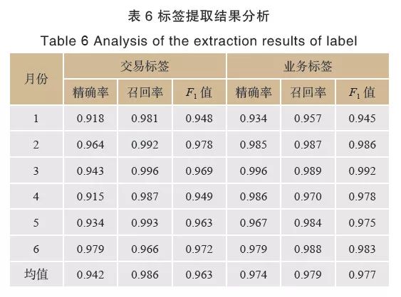 從結(jié)果分析表中可知,6個月的交易摘要的交易標(biāo)簽和業(yè)務(wù)標(biāo)簽提取精確率均在90%以上,部分月份達(dá)到98%,召回率均在95%以上,整體F1值超過94%。