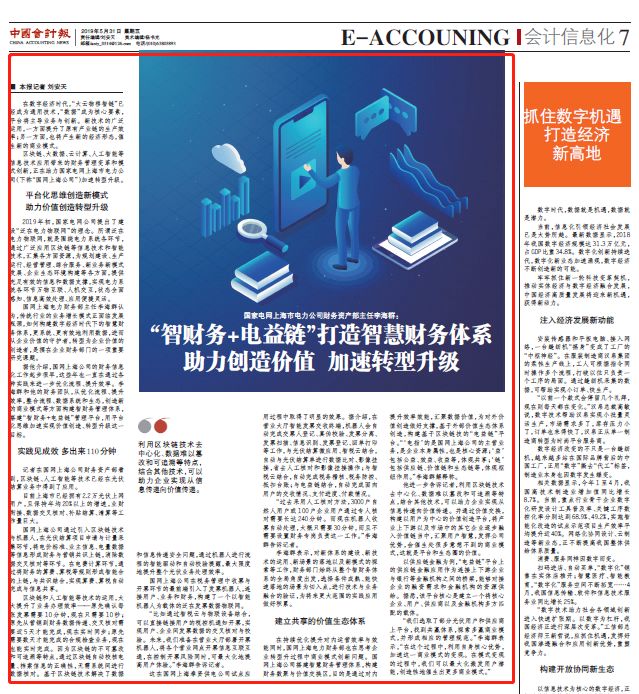 數(shù)字經(jīng)濟時代,國網(wǎng)上海市電力公司積極創(chuàng)新,運用“大云物移智鏈”等新技術(shù)進(jìn)行財務(wù)管理變革和模式創(chuàng)新,打造“智財務(wù)+電益鏈”的智財務(wù)體系,加速財務(wù)轉(zhuǎn)型升級,助力國網(wǎng)上海市電力公司的高質(zhì)量發(fā)展。遠(yuǎn)光軟件作為國網(wǎng)上海市電力公司數(shù)字化征程的合作伙伴之一,將一如既往,精研技術(shù),創(chuàng)新應(yīng)用,為其可持續(xù)發(fā)展提供源源不斷的技術(shù)支撐。近日,《中國會計報》對國網(wǎng)上海市電力公司的智慧財務(wù)項目建設(shè)進(jìn)行了深入報道,小編為您轉(zhuǎn)載如下: