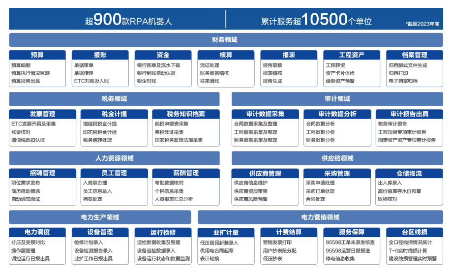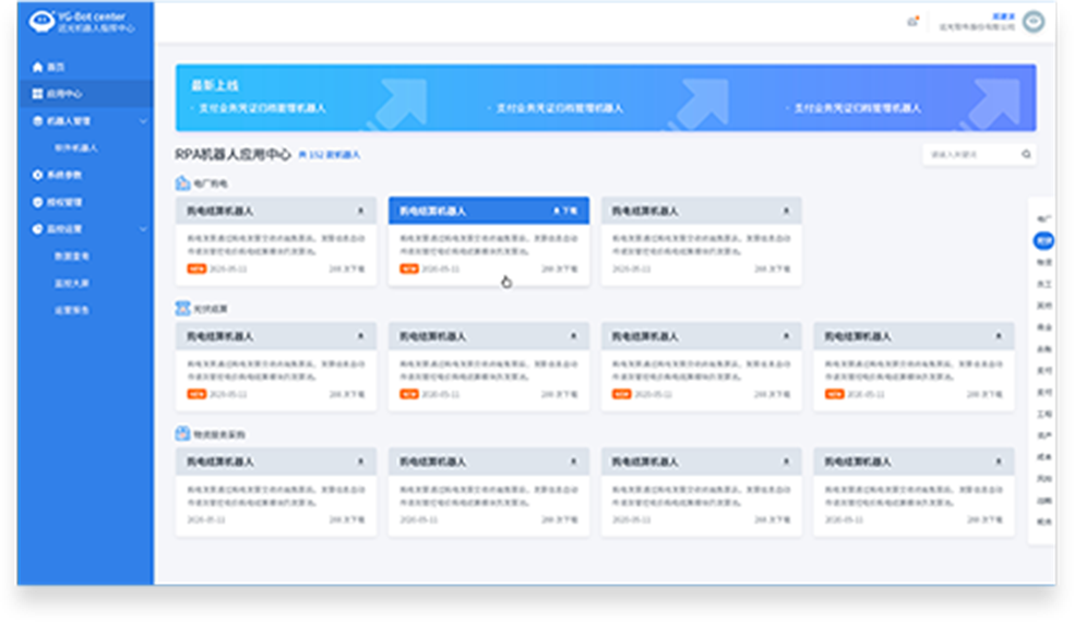遠(yuǎn)光軟件自主研發(fā)的RPA云平臺(tái)關(guān)注企業(yè)應(yīng)用場(chǎng)景的擴(kuò)展,企業(yè)可利用平臺(tái)“自助式”創(chuàng)建RPA機(jī)器人,并對(duì)機(jī)器人進(jìn)行智能化管理。目前RPA機(jī)器人已實(shí)現(xiàn)全國(guó)31個(gè)省(自治區(qū)、直轄市)的全覆蓋,并廣泛應(yīng)用于能源電力、航天航空、冶金冶煉、制造、金融、醫(yī)療衛(wèi)生等領(lǐng)域的大型集團(tuán)企業(yè)。