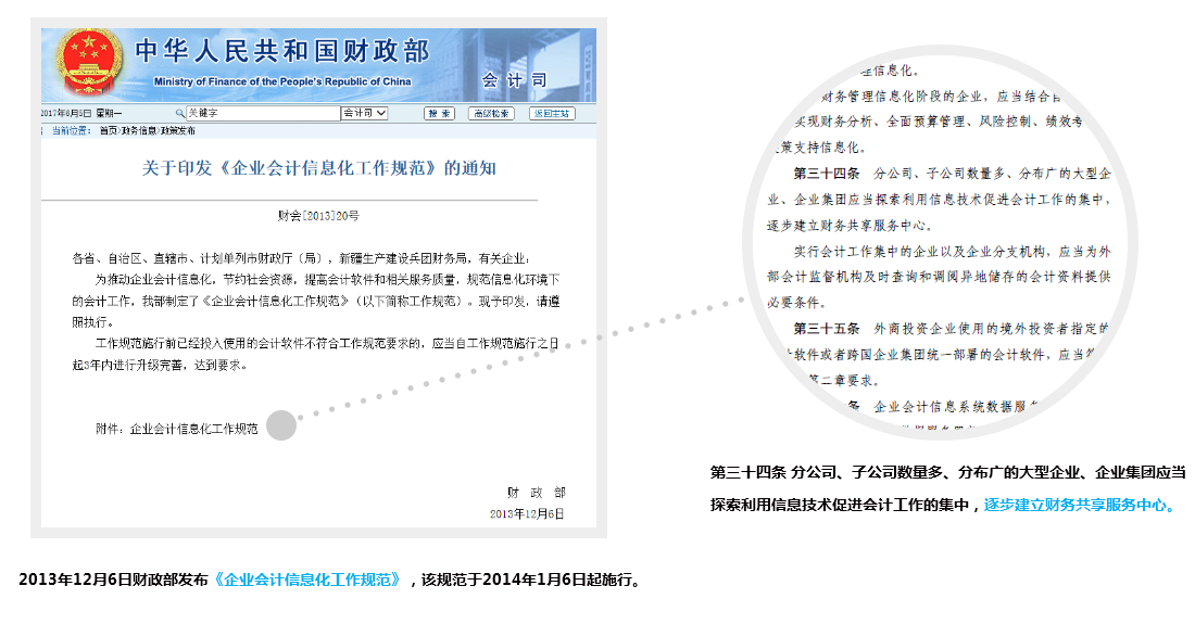 作為目前企業(yè)壓縮成本、改善管理流程、提高服務(wù)水平中成效較為卓著的一種管理體系,財(cái)務(wù)共享得到了國(guó)資委、財(cái)政部的認(rèn)可,在政策層面積極推動(dòng)央企集團(tuán)加速構(gòu)建財(cái)務(wù)共享服務(wù)中心?!蛾P(guān)于加強(qiáng)中央企業(yè)財(cái)務(wù)信息化工作的通知》、《企業(yè)會(huì)計(jì)信息化工作規(guī)范》、《關(guān)于全面推進(jìn)管理會(huì)計(jì)體系建設(shè)指導(dǎo)意見》等文件先后出臺(tái),鼓勵(lì)大型企業(yè)和企業(yè)集團(tuán)建立財(cái)務(wù)共享服務(wù)中心,加速會(huì)計(jì)職能從重核算到重管理決策的拓展。