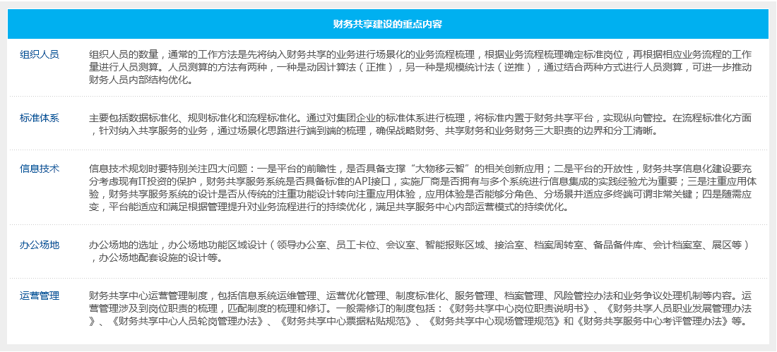 財(cái)務(wù)共享服務(wù)中心是一個(gè)五維的綜合體系建設(shè),缺一不可,建設(shè)的重點(diǎn)內(nèi)容包括: