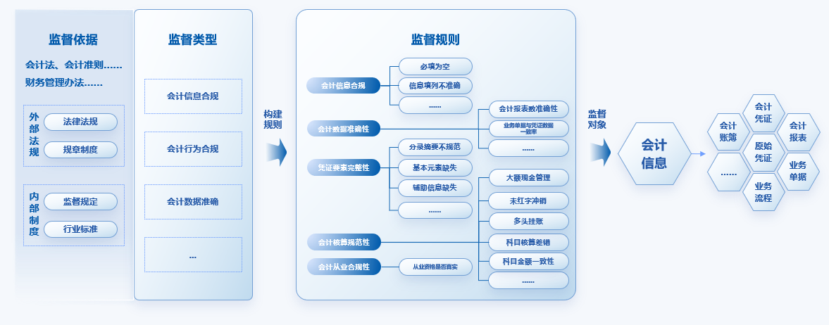 通過“財會監(jiān)督場景化、場景規(guī)則化、規(guī)則數(shù)字化”,充分運用企業(yè)數(shù)據(jù)中臺的數(shù)據(jù)匯聚及大數(shù)據(jù)計算能力,構建企業(yè)級財會監(jiān)督規(guī)則庫,將規(guī)則嵌入企業(yè)經(jīng)濟活動,提供端到端“事前預防·事中控制·事后審查”的全級次、全覆蓋的實時校驗、判斷、約束、預警服務,阻斷財會違規(guī)風險。