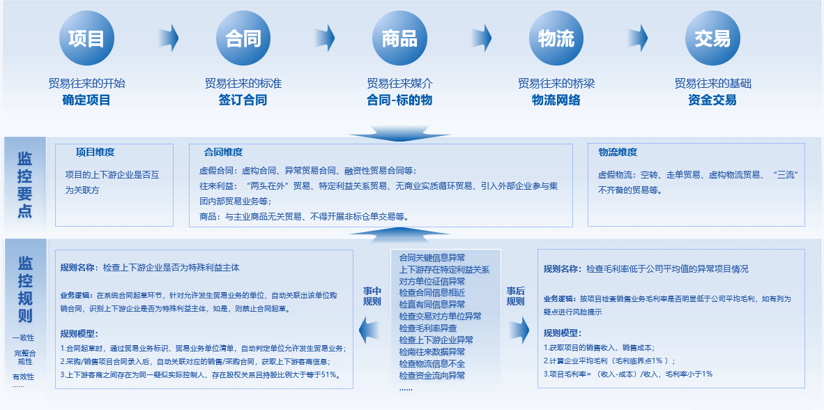 以虛假貿(mào)易風險防控為例,通過匯聚企業(yè)內(nèi)部信息(資金、合同、發(fā)票等)、外部數(shù)據(jù)(工商、司法等),可視化展示虛假貿(mào)易規(guī)則清單、虛假貿(mào)易風險方案、風險方案識別結(jié)果、風險結(jié)果應對信息等,利用虛假貿(mào)易風險防控模型精準監(jiān)測貿(mào)易風險點,自動觸發(fā)預警機制,實現(xiàn)個性化的風險防控分析,從而及時、精準地識別并有效防控虛假貿(mào)易風險。