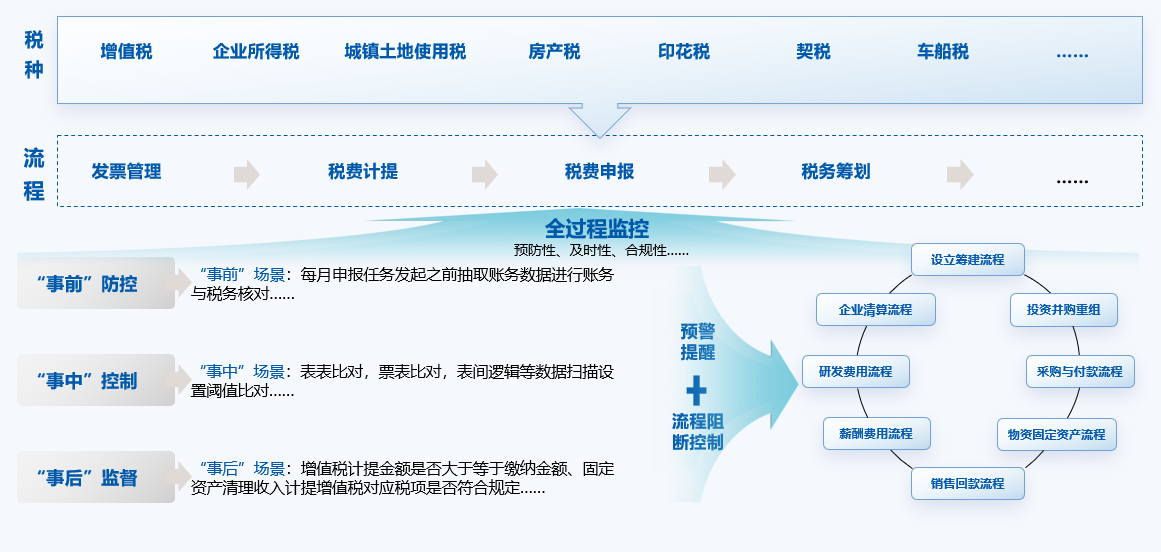 通過涉稅風險體系構建、過程風險防控、涉稅風險監(jiān)控預警、整改治理及迭代更新機制,夯實涉稅管理體系基礎,全流程風險管控;通過對涉稅過程的全面監(jiān)測和稅務異常的及時預警,逐步實現(xiàn)涉稅風險防控手段由事后稽核向事中控制的轉(zhuǎn)變,打造稅務風險“全過程+異常預警”的管控模式。