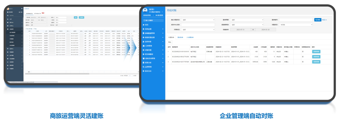 支持預(yù)付款、月結(jié)多種結(jié)算方式,對賬模式支持按月、按訂單完成維度生成結(jié)算賬單,系統(tǒng)提供線上自動對賬功能。商旅企業(yè)管理端自動獲取賬單、自動對賬、申請開票,運(yùn)營方開票后自動同步至企業(yè)商旅端,滿足企業(yè)結(jié)算需要。